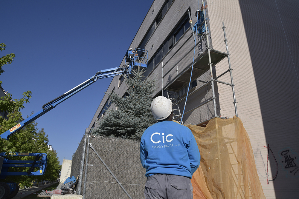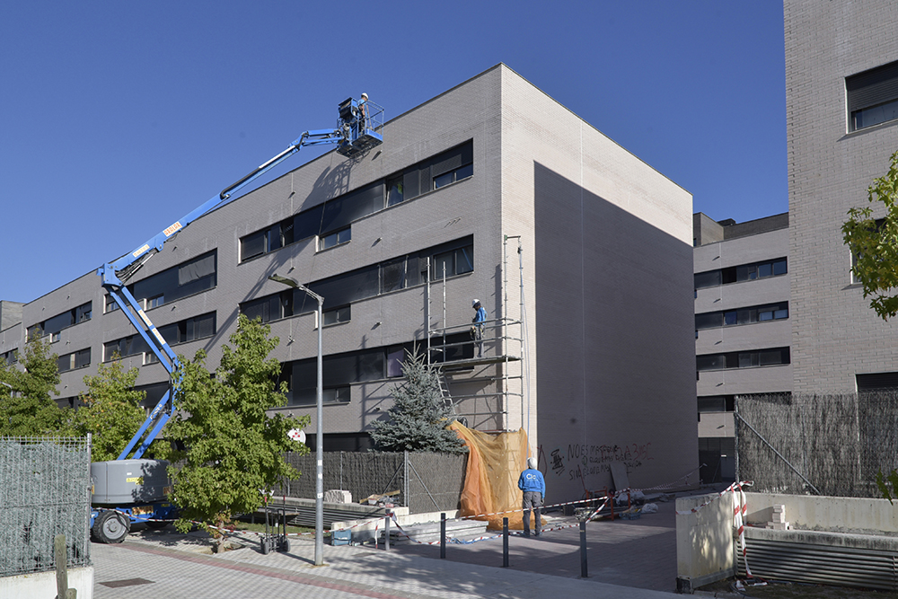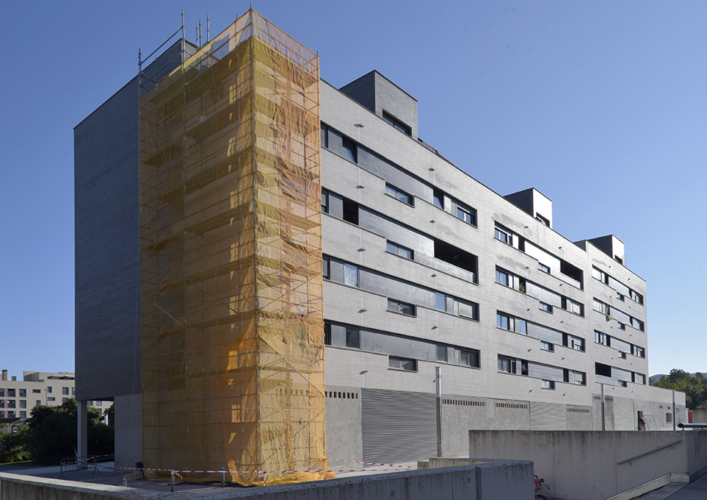 Fachada en calle Ibia y Puerta Aranguren Estudio, colocación de andamios y realización de diferentes trabajos de rehabilitación en la fachada de calle Ibaia 1-11 y Puerta de Aranguren 71-87 en Sarriguren.